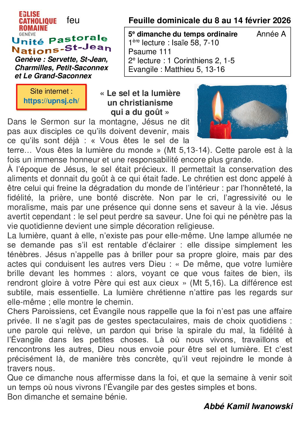 Samedi 7 février 2026 A la salle paroissiale de St-Jean XXIII 10h00-11h30 : groupe 1ère…