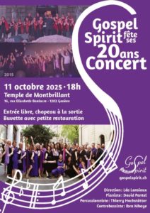 SAMEDI 11 OCTOBRE 2025 – Gospel Spirit fête ses 20 ans Samedi 11 octobre 2025 A 18h00 au temple de Montbrillant 16, rue Elisabeth Baulacre Like Tweet